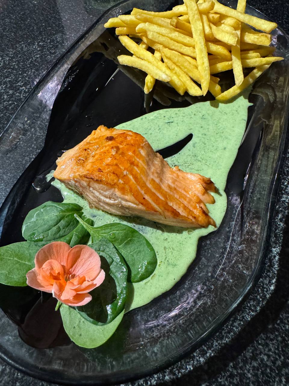 Филе форели со сливочно-шпинатным соусом красной икрой и картофелем фри 400гр