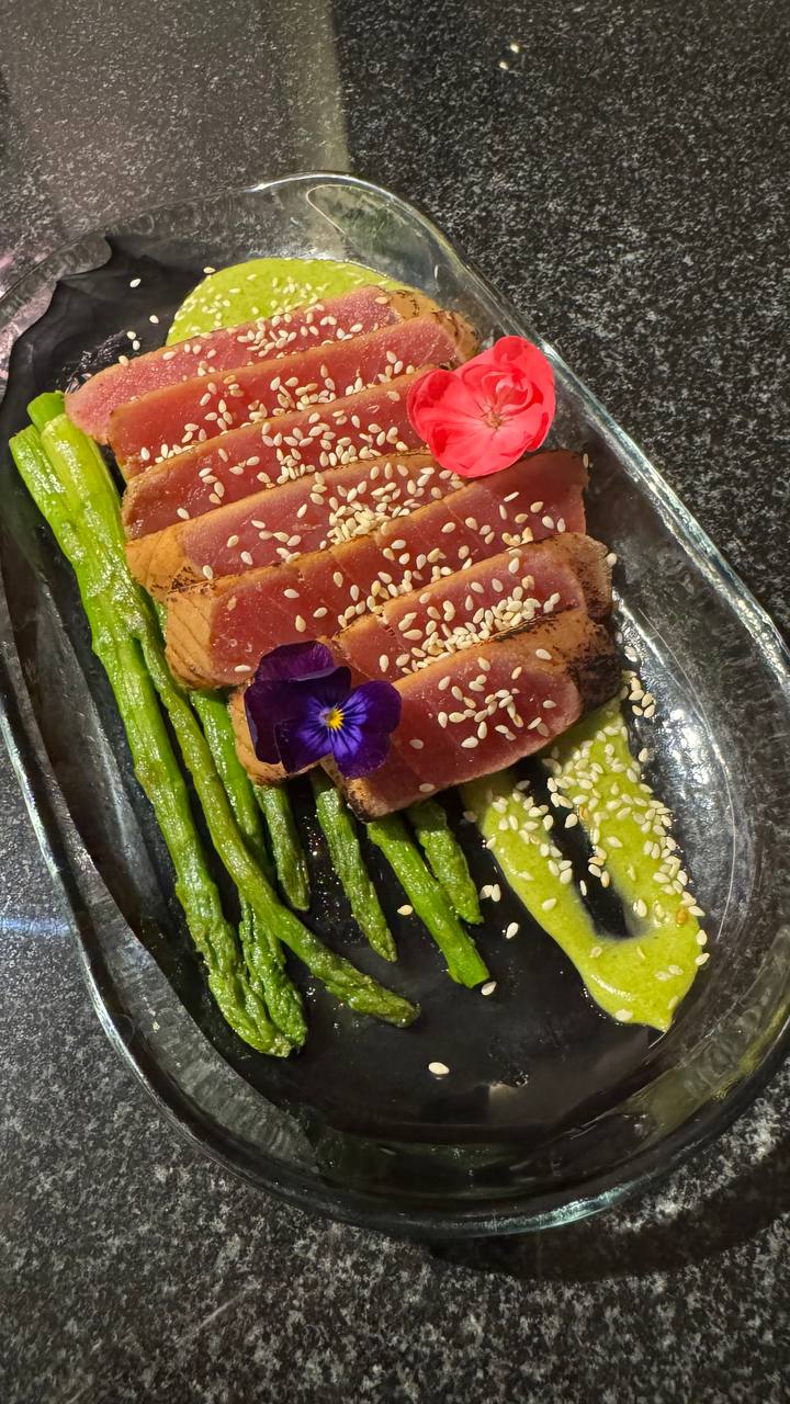 Тунец татаки со спаржей и соусом манго-базилик 370гр