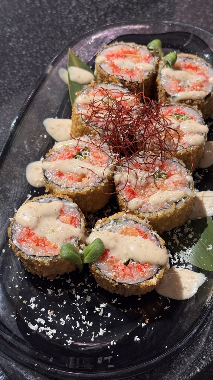 Ролл темпура с копченым лососем и соусом спайси