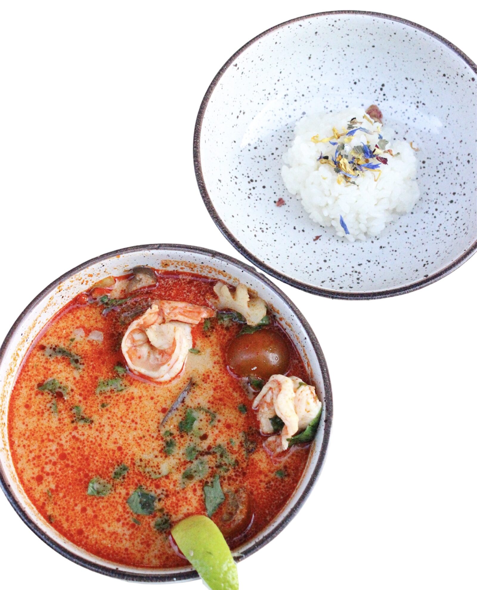 креветка, кокосовое молоко, кальмар, имбирь, лук, грибы шиитаке, чили перец, лайм, кинза , рис , цветы , куриный бульон