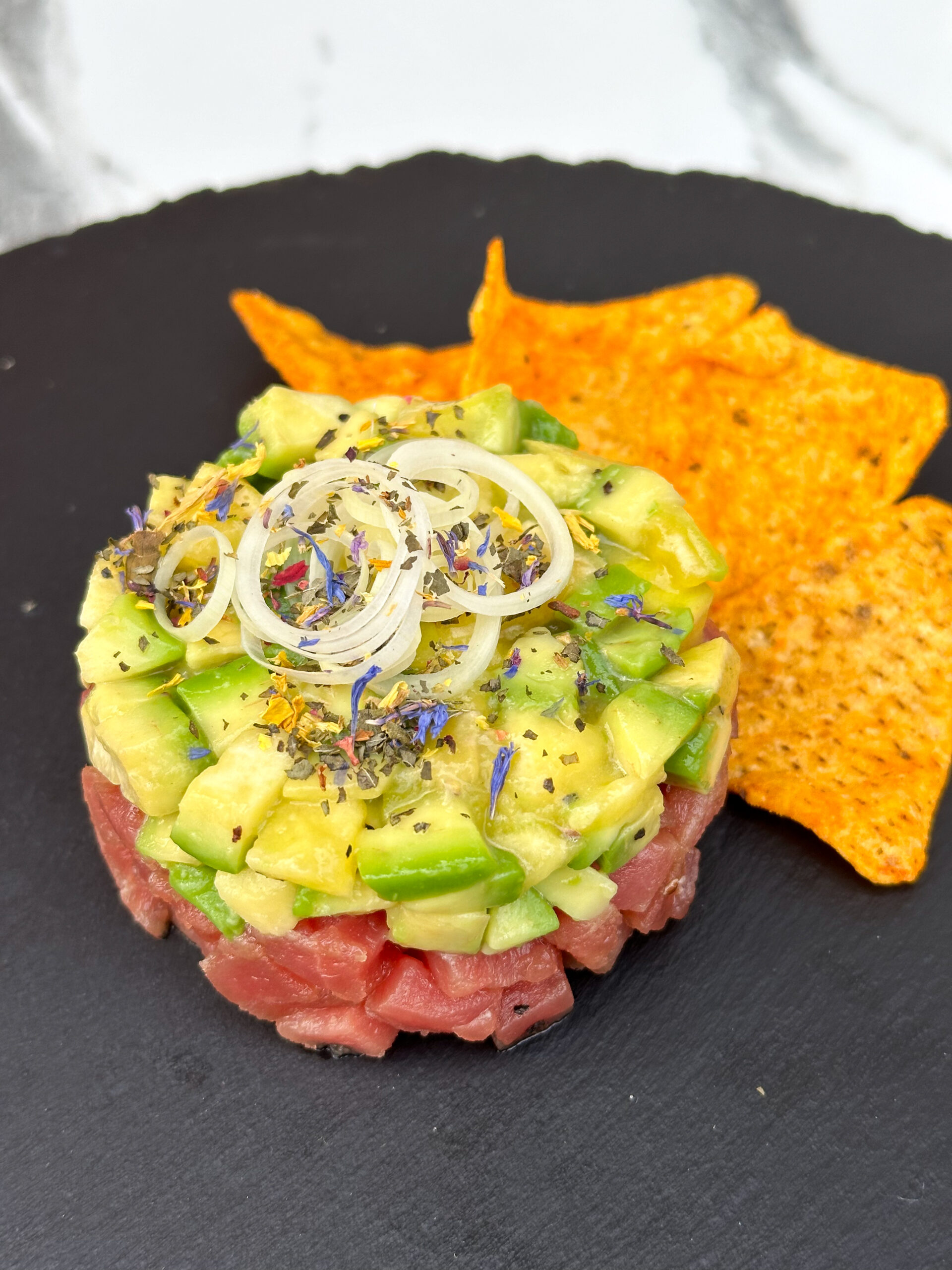 Тунец, манго, авокадо, лук, соус, начос. 190гр